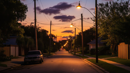A tranquil suburban street captured at sunset, showcasing street lights illuminating the path. The scene evokes peace and a sense of calm in the evening light.