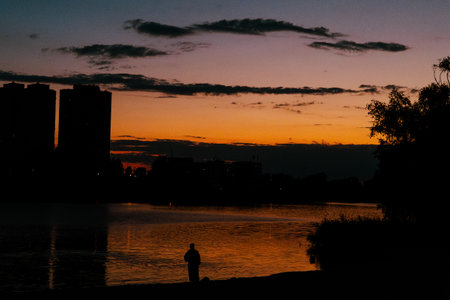 Vibrant sunset casting a warm glow over the lake and a lone fisherman. A stunning sunset bathes a tranquil lake, silhouetting buildings and a person fishing, creating a serene and peaceful atmosphere.