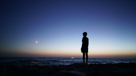 silhouette of a boy against the backdrop of the sea and lunar landscape