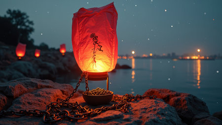 Juneteenth Tranquil evening lanterns by the waterfront. That the image is generated using AI.