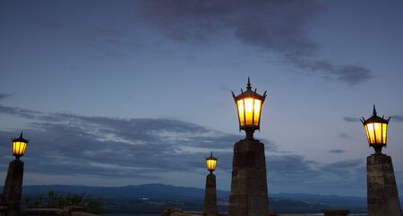 Evening light with illuminated urn as a lamp on balcony wall.