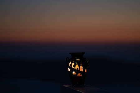 Romantic candle with dark sunset sky. Concept of romantic sea view dinner.