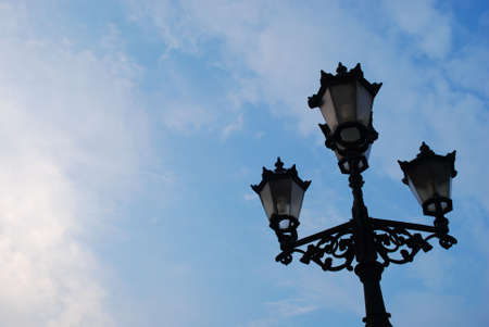 Close up photo of an old styled street lamp against a clear blue sky