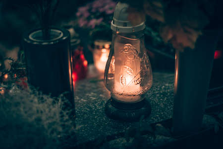 burning candles, colorful flowers and festive decorations on graves in graveyard