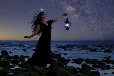 Young Woman Looking to the Sea With Milky Way