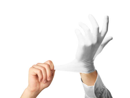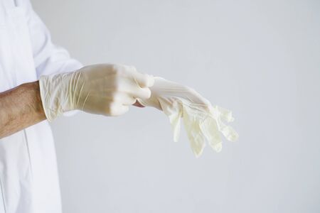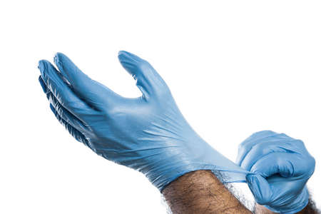 man puts on his hands blue surgical rubber protective gloves on a white background
