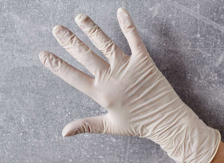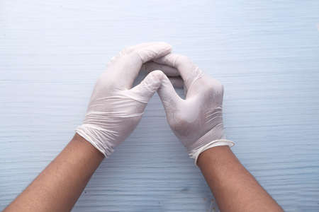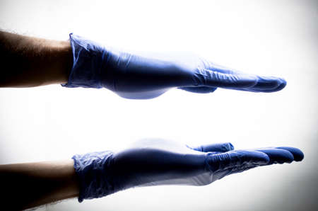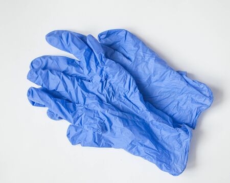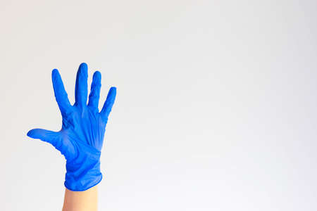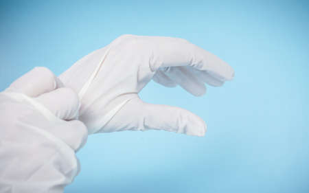 hand in a blue protective surgical glove shivers white gloves on the white background