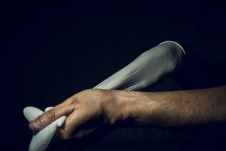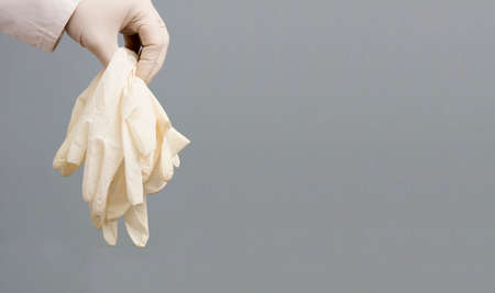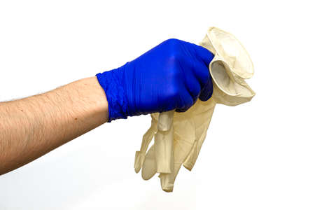 Person taking off a latex glove correctly so as not to get infected Conceptual hygiene, fight against covid-19, coronavirus and its impact