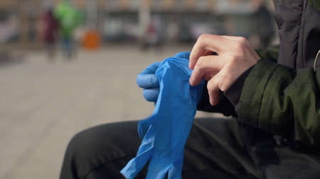 Close up hands of a young man putting on a protective gloves outdoors. Coronavirus epidemic. Concept of health and safety life. COVID-19 pandemic