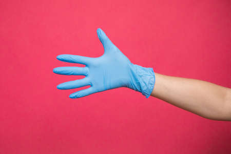 Palm of hand in medical glove on a red background. gesturing hand in white protective glove