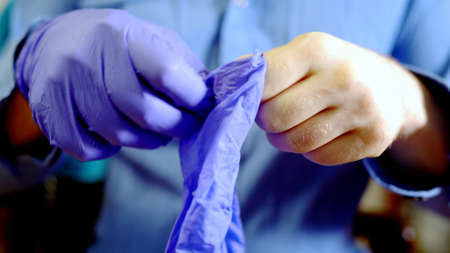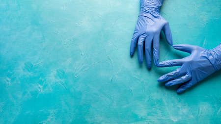 hands remove glove on blue background. The concept of treatment, protection from viruses, flu, recovery, stop coronavirus.