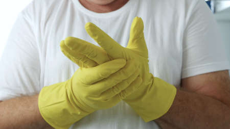 Man Puts His Yellow Protective Gloves on His Hands Preparing to Start Cleaning in the Kitchen and Bathroom