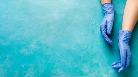 COVID-19 measures. Pandemic prevention. Hands in medicine gloves on textured blue copy space. Quarantine restriction. Hygiene protection