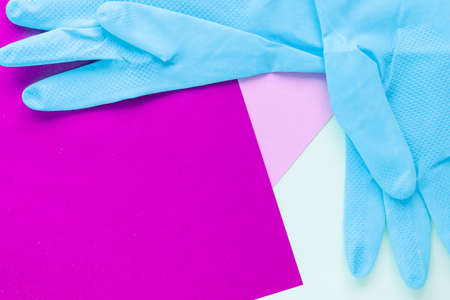 View from above on blue protective gloves. The gloves lie against a pink background. The gloves are slightly crumpled. They are sturdy, not thin, for cleaning indoors