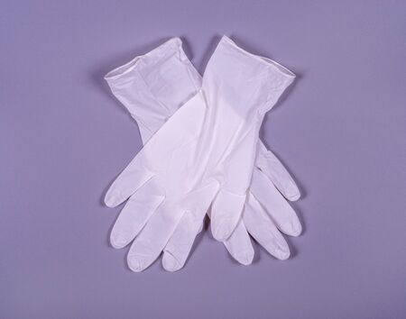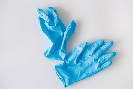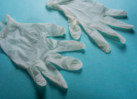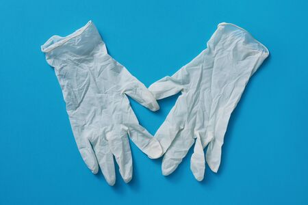 Whitte surgical gloves isolated on the blue background. Concept protect against infection or contamination.
