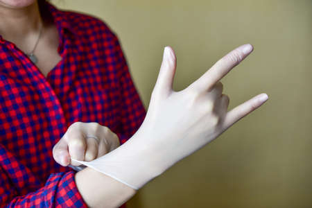 Personal protective equipment vinyl disposable gloves, woman puts her hands in gloves.