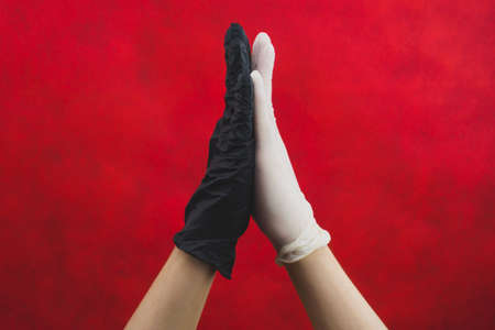 High five in protective gloves on a red background. one hand in black glove, other in white. gesturing hands in medical gloves