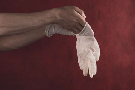 Hands in medical gloves on a red background. a person puts on surgical gloves