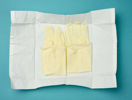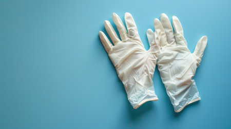 high angle view of a pair of white disposable surgical gloves on a blue background