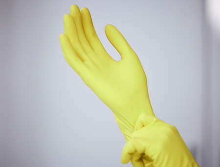 Have to protect my hands. an unrecognizable person applying gloves before cleaning at home.