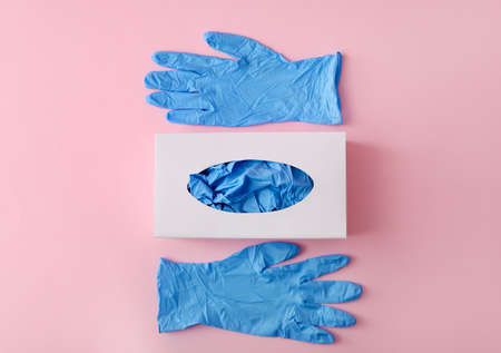 White surgical gloves are isolated on the blue background. The concept protects against infection or contamination