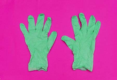 Two medical gloves on a pink background. White and blue latex gloves. Medical glove for protection and patient care. Pink background.