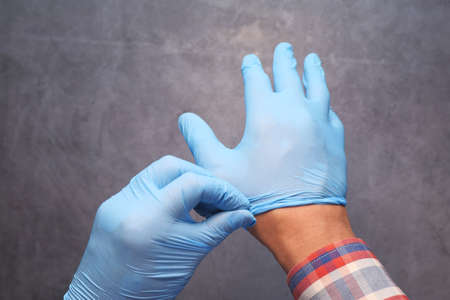 Banner closeup man wearing blue latex medical gloves on hands. Professional doctor putting on sterile protective gloves. Preparation for patient examination. Personal protection. Coronavirus COVID-19