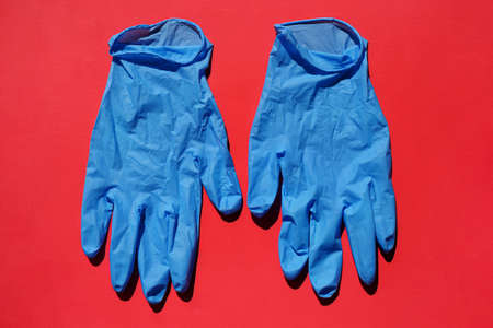 Pair of medical blue latex protective gloves on red background. Protective disposable gloves against the spread of virus, flu, coronavirus (COVID-19), bacterial. Health care and surgical concept.