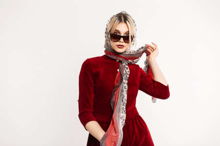 Glamorous young woman model straightens vintage leopard shawl. Attractive girl blonde with sexy lips in fashionable sunglasses in elegant red dress posing in studio near white wall. Luxurious lady.