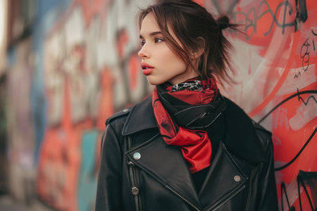 Fashionable female model with a leather jacket and red scarf on graffiti background