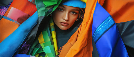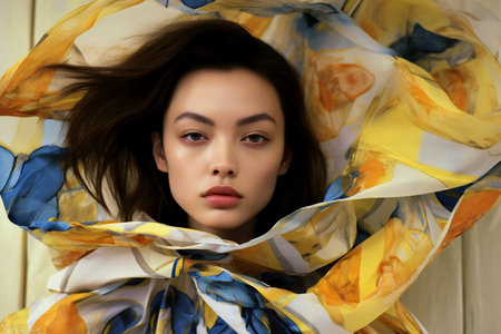 A stunning young woman gazes into the distance, her face framed by delicate, flowing orange fabric against a vibrant blue sky. The image captures a moment of serene beauty, evoking feelings of freedom and grace as the soft fabric dances in the wind.