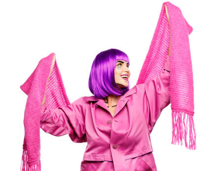 Girl with beautiful red hair and colorful dress and fabric over white background