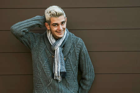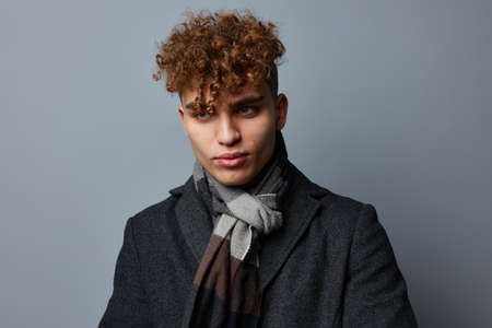 young pretty woman or fashionable sexy girl with cute face and blonde hair in scarf and leather jacket on white brick wall background
