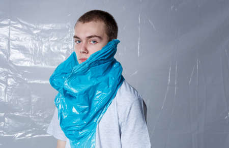 Horizontal view. Frontal portrait of a guy have covered mouth with blue plastic bag, shot in studio, over gray background. copy space. Ecologic content.