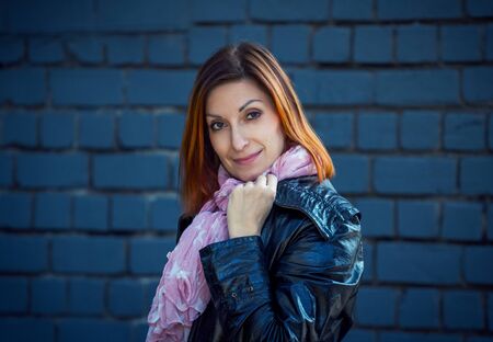 Portrait of beautiful smiling woman with red hair, wearing black leather jacket and pink scarf, posing in front of brick wall