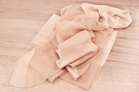 Elegant silk scarf with orange, beige and gray stripes, illuminated by sunlight, creating a minimalist and stylish composition