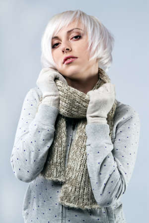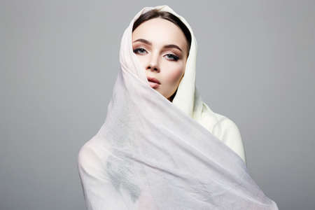 Beautiful girl with clean skin and dark long hair in cozy white sweater and warm scarf on the beige background