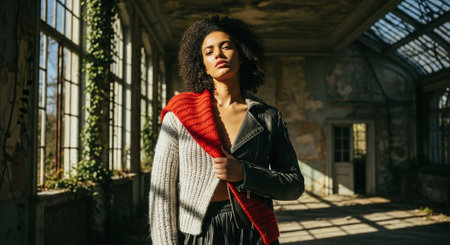 Beautiful young african american woman with curly hair, wearing a red scarf, posing in an abandoned building.