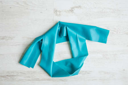 Flat lay view of blue resistance exercise latex rubber band on wood laminate floor.