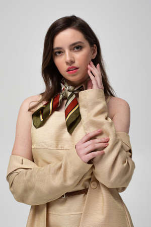 European woman with dark hair in beige suit with bright silk scarf isolated on light grey with hand near the face