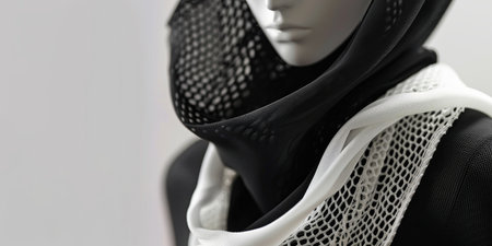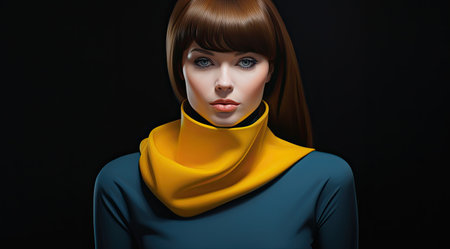 A young woman poses confidently with her hair gently flowing. She wears a fashionable scarf that adds a modern touch. The background is neutral highlighting her features and expression.