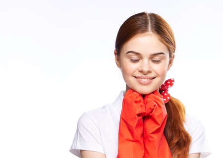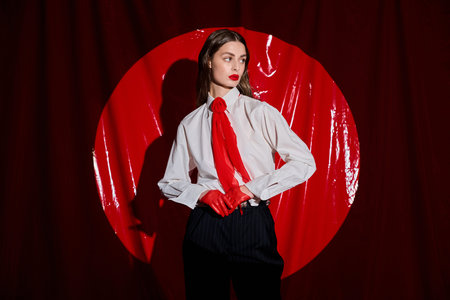 Confident young woman in a chic outfit white shirt, red tie, and gloves, exuding elegance.