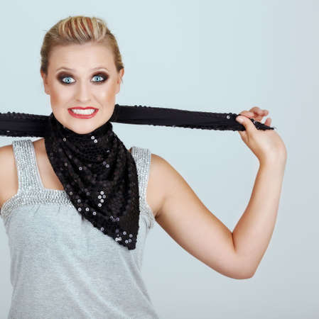 Fashion victim: young woman with stressed expression strangling herself with a sequence scarf.