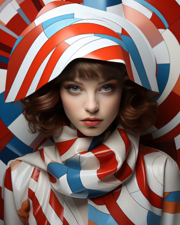 A vibrant girl with a doll-like appearance wears a bold striped hat, radiating confidence and playfulness in her colorful ensemble