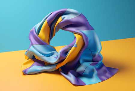 3d render, abstract background with a silk scarf in blue and yellow colors