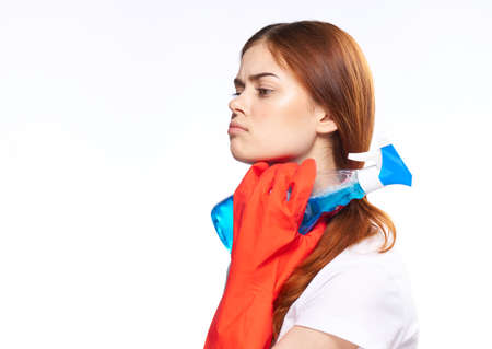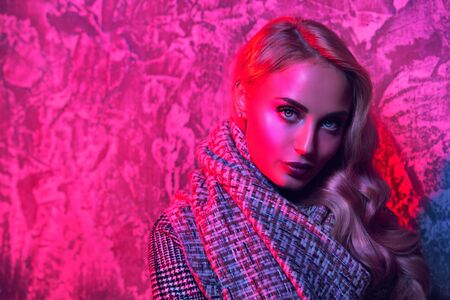 A portrait of a fashionable bright lady posing in red light in studio. Fashion for women. Bright light.