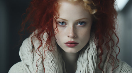 A young woman showcases her beauty and confidence with long flowing hair while wearing a cozy scarf. The background features a soft blue hue enhancing her striking presence.