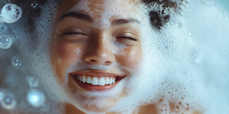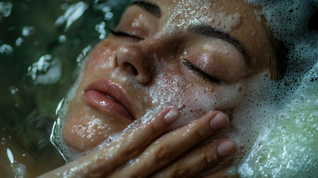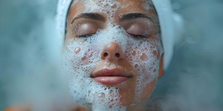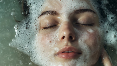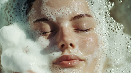 This close-up image captures the serene expression of a person with soapy bubbles on their face, highlighting freshness and relaxation.