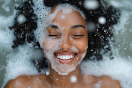 A dark-skinned man with his eyes closed and a joyful expression on his face enjoys bubble bath, drops of water glistening on his face, emphasizing the moment of pure bliss. Soft masculinity