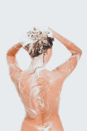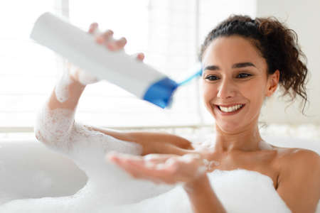 Beautiful young woman lying in warm bath, using shampoo or foam at home. Wellness concept
